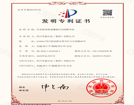 • 四川禾嘉一項(xiàng)具有原始創(chuàng)新非能動(dòng)智能控制技術(shù)的 “壓差驅(qū)動(dòng)管道爆破應(yīng)急阻斷系統(tǒng)”獲得中國發(fā)明專利 [ 2025-11-07 ]